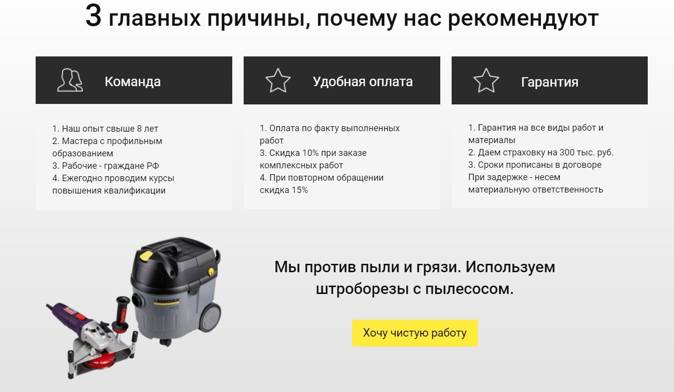 Выяснил, что большинство людей не хотят, чтобы в процессе монтажа грязь распространялась по квартире или коттеджу. Заказчик использует специальный «штроборез с пылесосом», который собирает все пыль и грязь при монтаже. Поэтому вынес данное преимущество в отдельный блок. Кстати, потому этот блок у нас скопировали конкуренты ;)