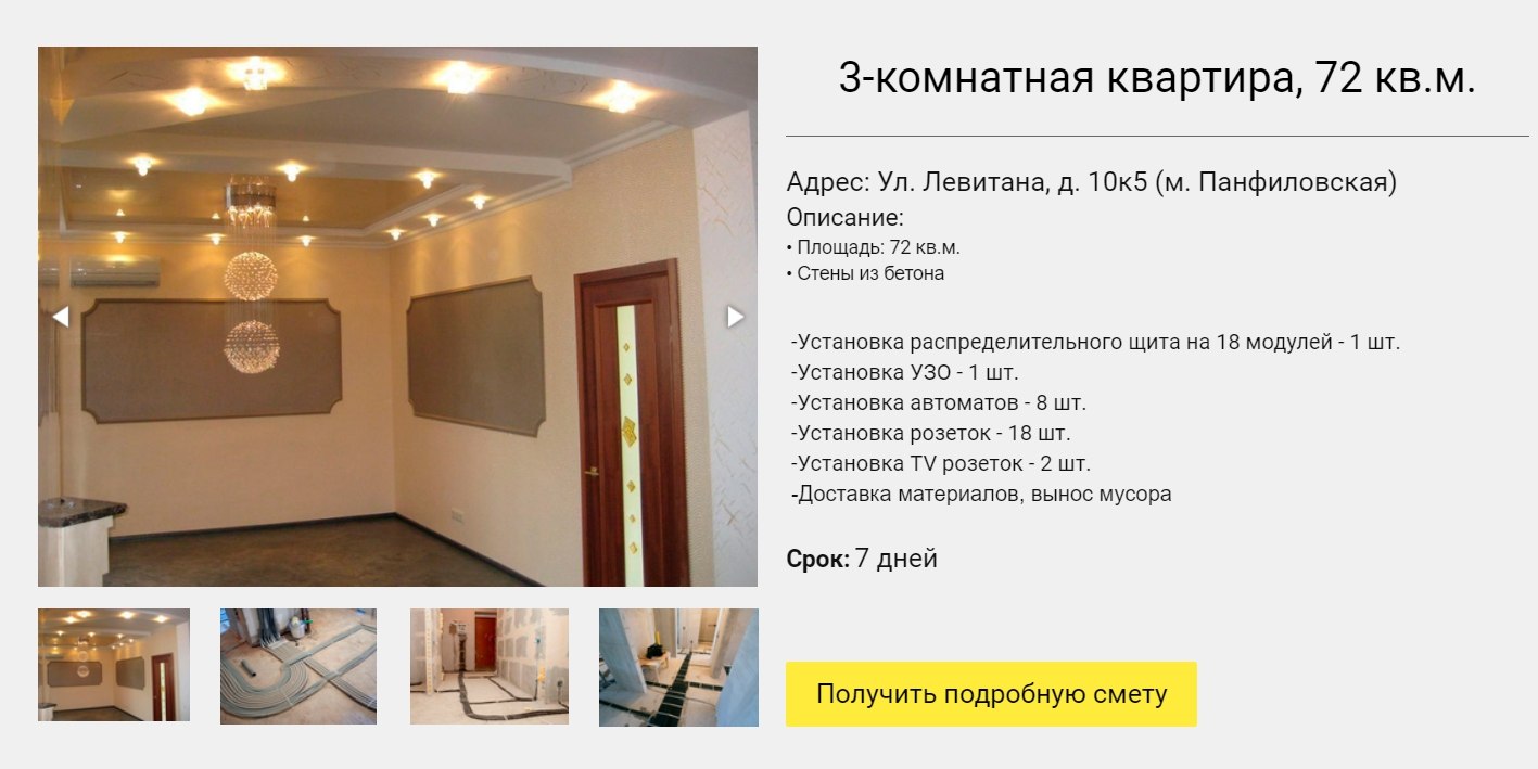 На сайте выложили не просто фотографии работ. По каждому объекту было выложено несколько качественных фотографий и описан состав работ. Блок закрывал клиента на получение подробной сметы