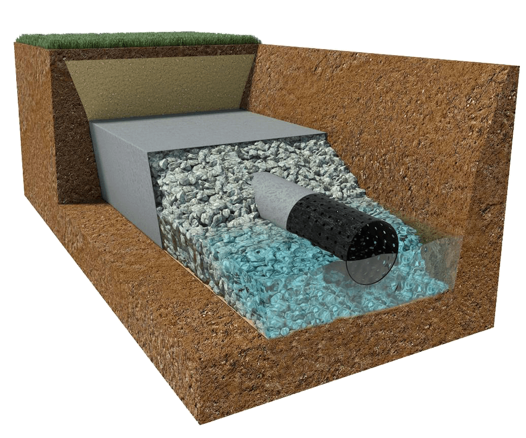 Это вариант глубинного дренажа, который монтируется в плотную к стене фундамента, а также в комплексе выполняются работы по гидроизоляции фундамента и монтаж ливневой канализации.